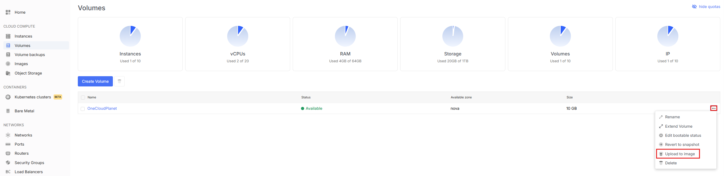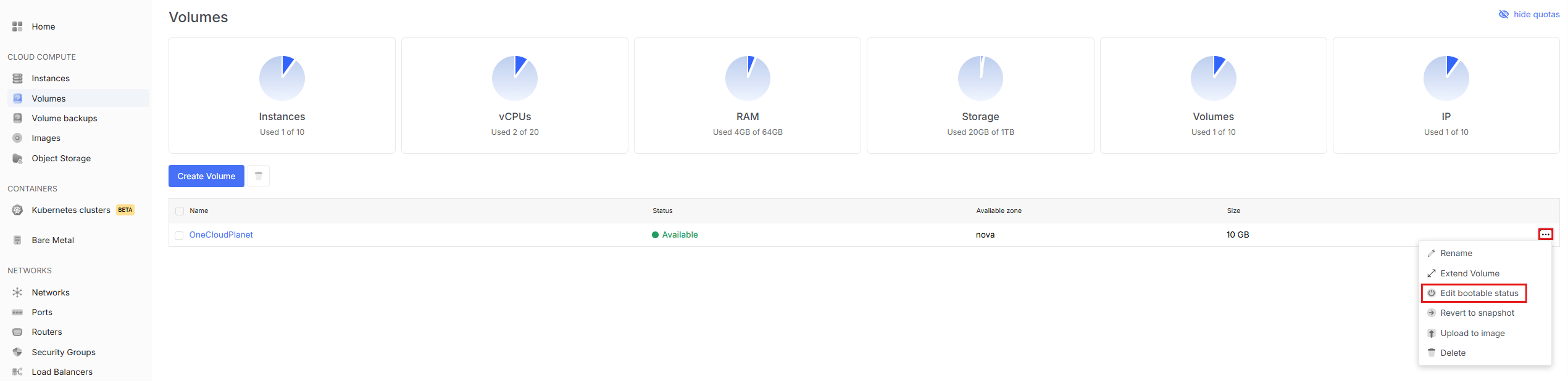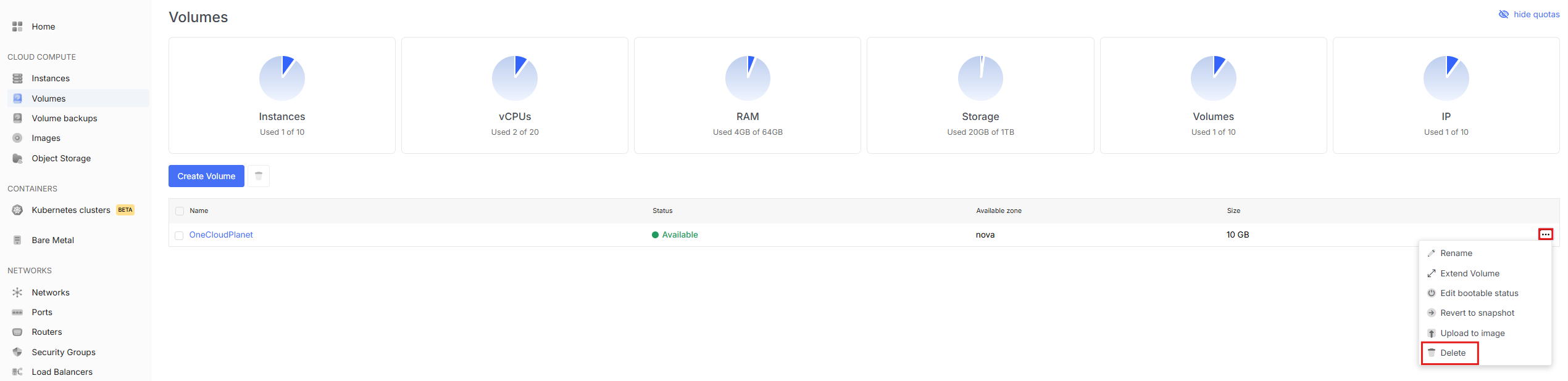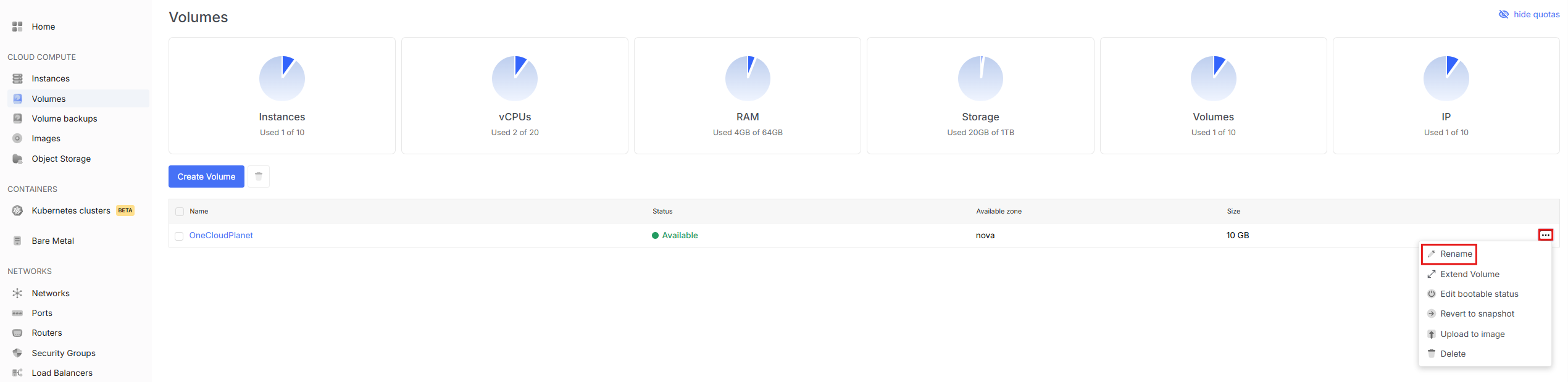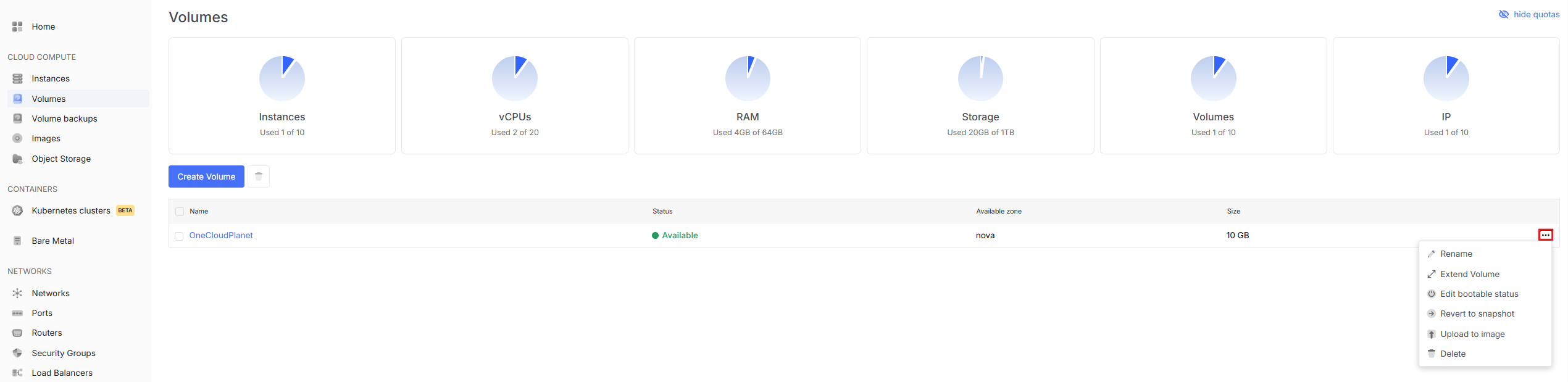 - To view available volume actions, go to the Volumes tab and open the dropdown menu by clicking the three dots next to the desired volume.