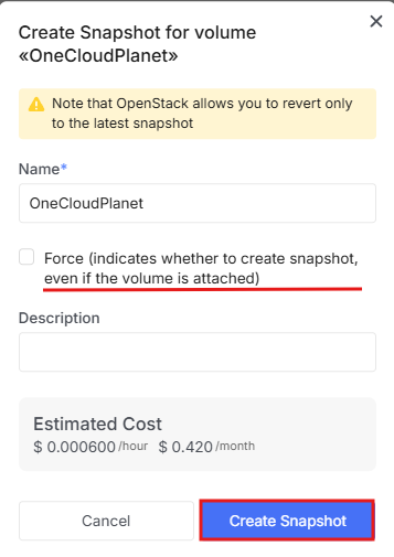 - In the window, enter a name, check the checkbox if needed and click Create Snapshot.
