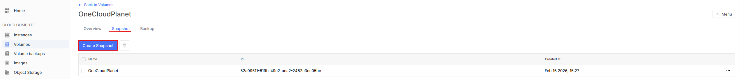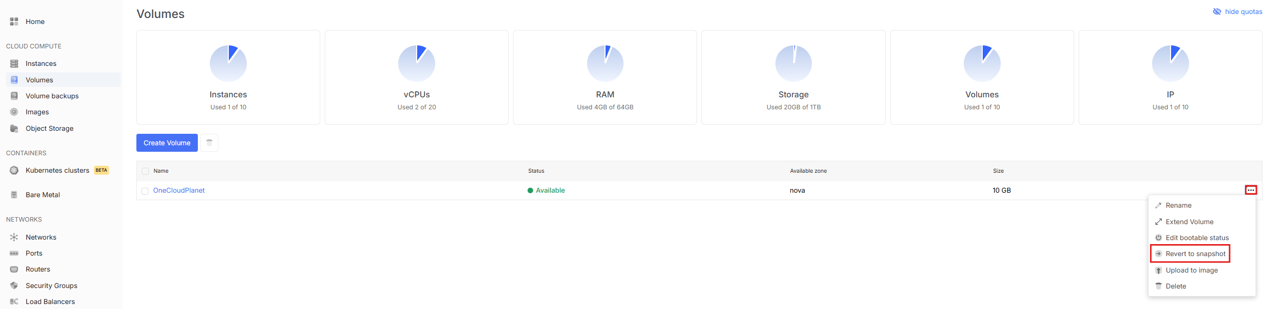 - To create a snapshot, go to the volumes tab, click on the volume itself, select the Snapshot tab at the top and click Create Snapshot.