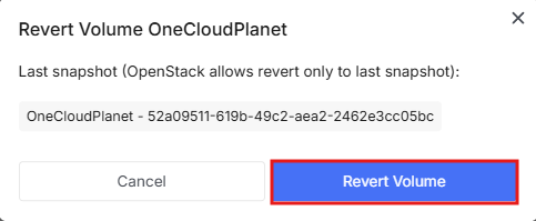 - The next window will show the last snapshot taken, click Revert Volume.