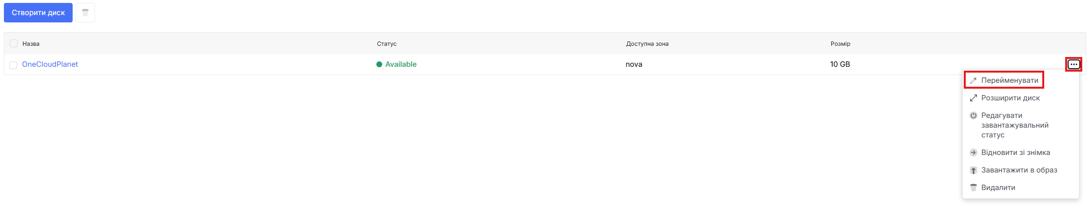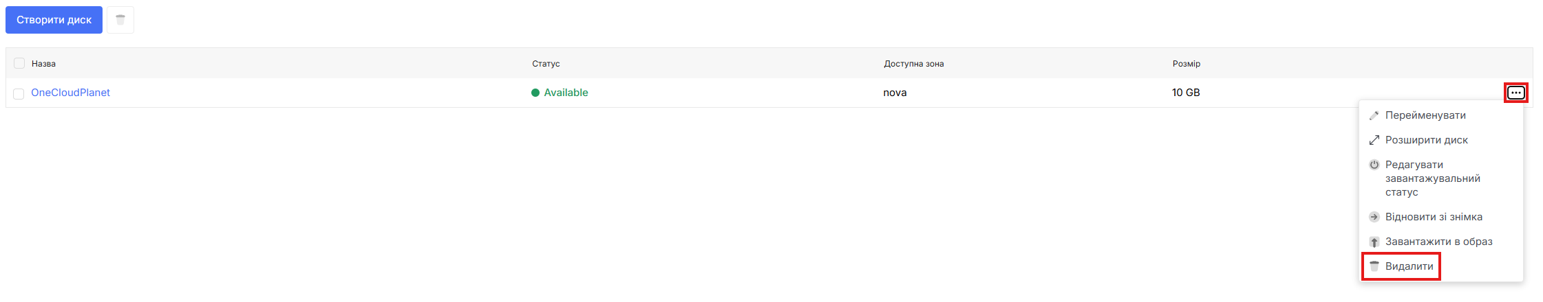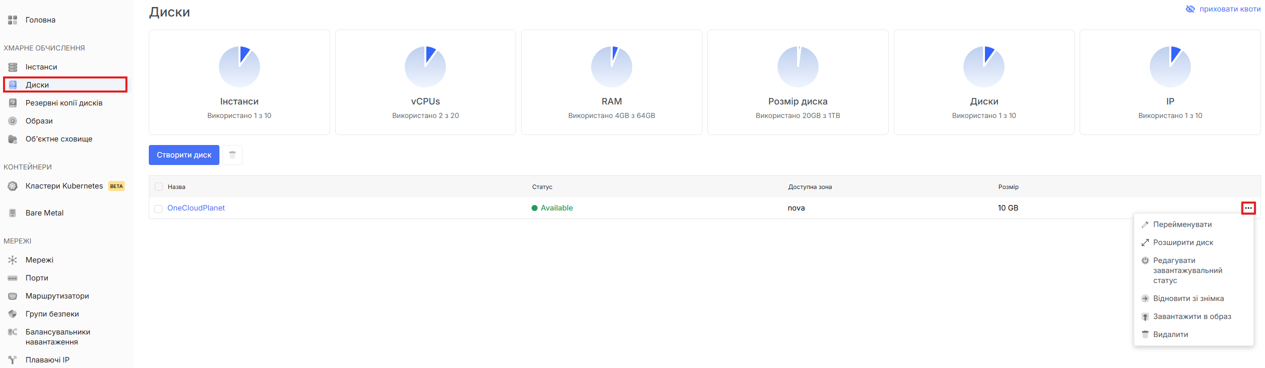 - Для перегляду дій з дисками перейдіть на вкладку диски та відкрийте спливаюче меню натиснувши на трикрапку напроти потрібного диску.