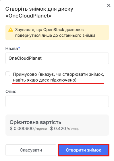 - У вікні введіть назву, встановіть прапорець за необхідності та натисніть Створити знімок.
