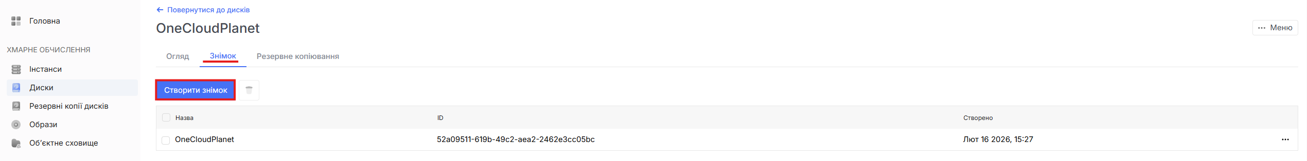 - Щоб створити знімок перейдіть на вкладку диски і натисніть на сам диск, виберіть вкладку знімок угорі та натисніть Створити знімок.